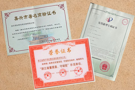 紅旗過(guò)濾全自動(dòng)過(guò)濾機(jī)專利證書(shū)和多項(xiàng)榮譽(yù)證書(shū)